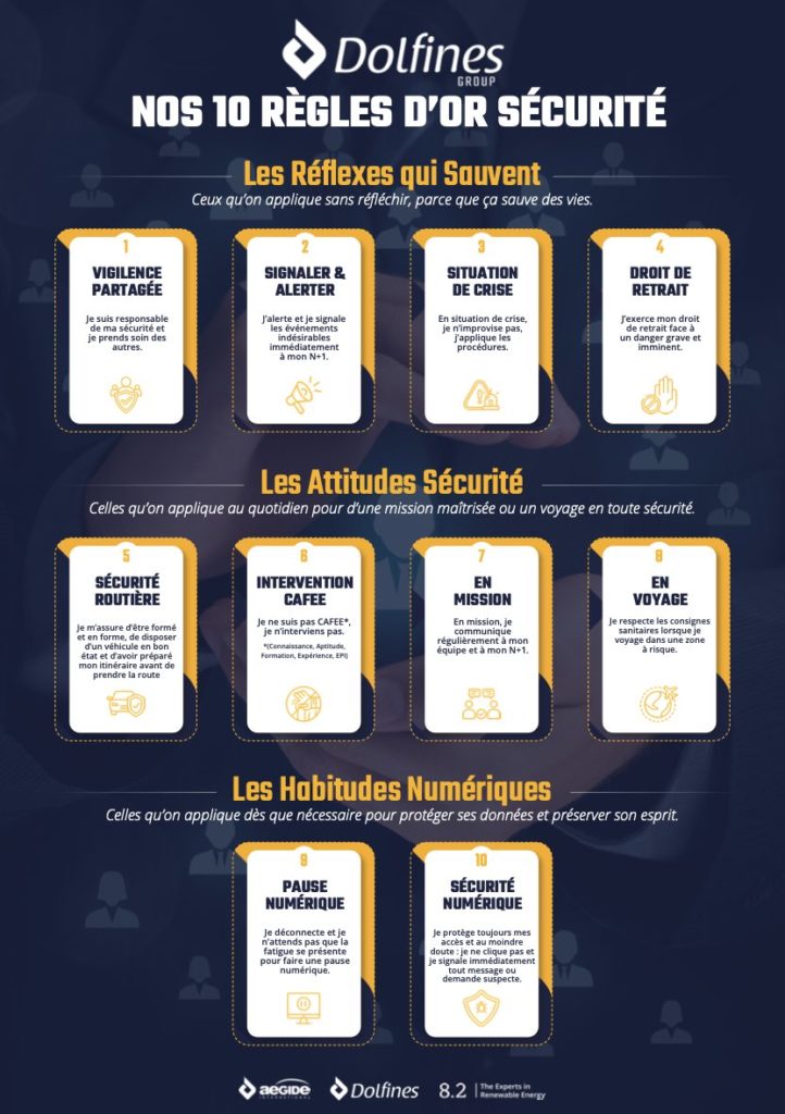 La mise en place des Règles d’Or dans le groupe Dolfines s’appuie sur une méthodologie rigoureuse et participative interne. Cette approche structurée vise à garantir l’adhésion de tous nos collaborateurs et l’ancrage durable des pratiques sécuritaires dans les activités quotidiennes de l’entreprise.